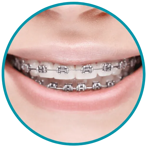 Metal braces straighten teeth and align the jaw by using brackets and wires tightened every 4-6 weeks.